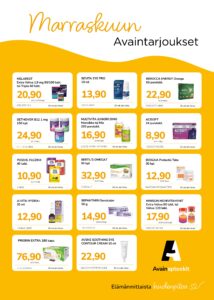 Olemme osa Avainapteekit – ketjua, mikä takaa asiakkaillemme aina tuoreinta tietoa terveydestä ja hyvinvoinnista sekä kuukausittain vaihtuvia tarjoustuotteita ja muita etuja. Tutustu avainasiakkuuteen.
